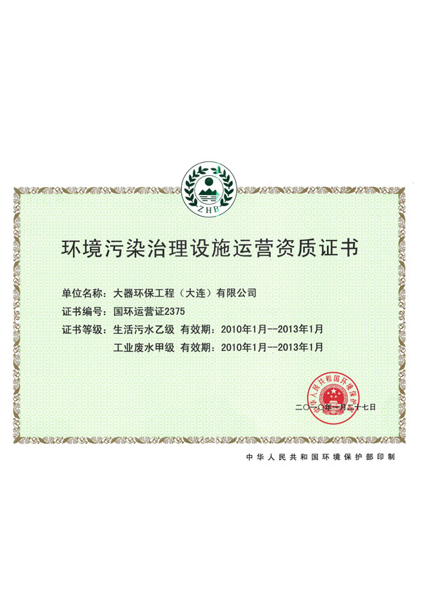 • 获得环境污染治理设施运营资质(生活污水乙级 工业废水 乙级)